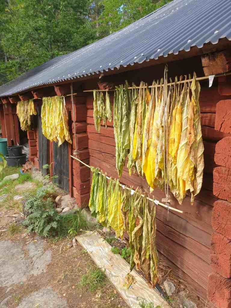 Ett av de tidiga odlingsåren fick jag för mig att jag skulle göra snus av tobak som skördats och torkats redan innan juli månad var slut. Alltså samlade jag alla blekgula, sladdriga små sandblad och omogna större blad som knäckts av vind och egen oförsiktighet och lät dem torka alldeles för tidigt i solen längs uthusväggen. Resultatet blev ‘Grufstugans nr 5’ ett förvånansvärt gott snus värmebehandlat i vitt vin om jag minns rätt.