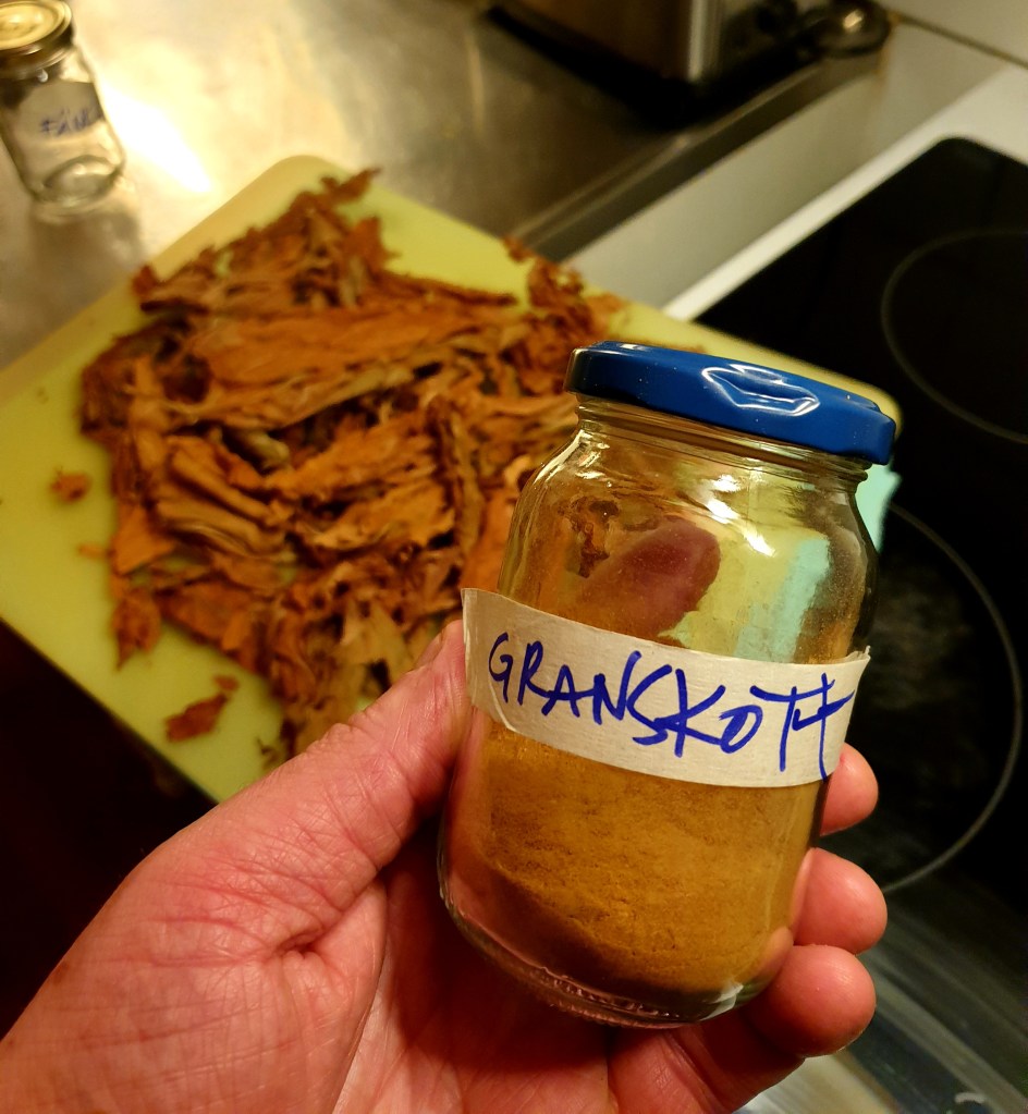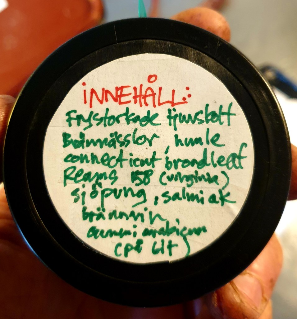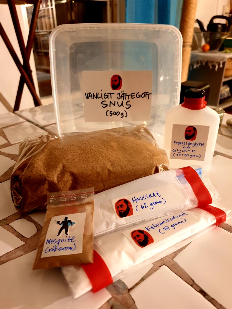 Henrik Larsson hade med gott resultat blandat nässlor med nikotinstark tobak för att sänka nikotinstyrkan och efter en lång tråd på Facebook om att ”kurera” omogen tobak genom att spränga cellerna i bladen genom att frysa den, skickade Sangrid massa tjuvskott från Värmland som jag frös i 24 timmar och sedan värmde upp igen i ugn på 80-90 grader. Hasse skickade humle och gummi arabicum på bit från Bornholm och Karl-Kungen sjöpungsfond från Göteborg. Ihop med chaga från Lena Gidlöf, salmiak, lite egen tobak och brännvin blev även detta ett riktigt gott snus.