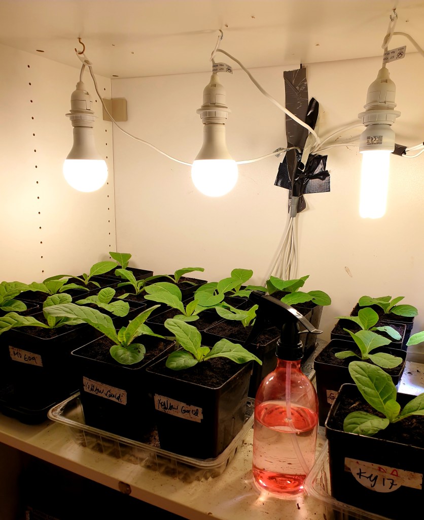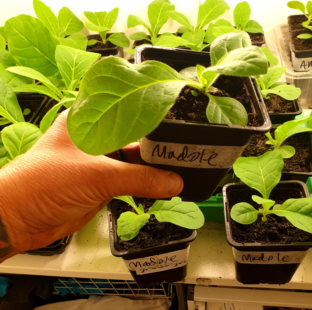 Som med allt annat går jag inte särskilt vetenskapligt tillväga och eftersom jag inte bor där jag odlar får jag pendla så att jag är vid tobaken så gott som varje helg, men gärna någon gång i veckan också. Jag gödselvattnar när jag har tillgång.