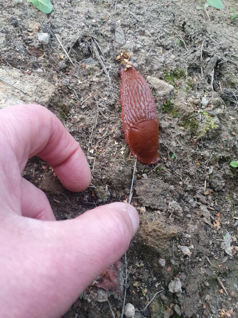 Jag jagar tidig morgon och i ficklampans sken på kvällarna under plantornas blad med ett vasst grillspett. När jag måste lämna odlingen en hel vecka för att verkligheten som brevbärare och andra störningsmoment tvingar mig strösslar jag ut snigelpellets och hoppas på det bästa.